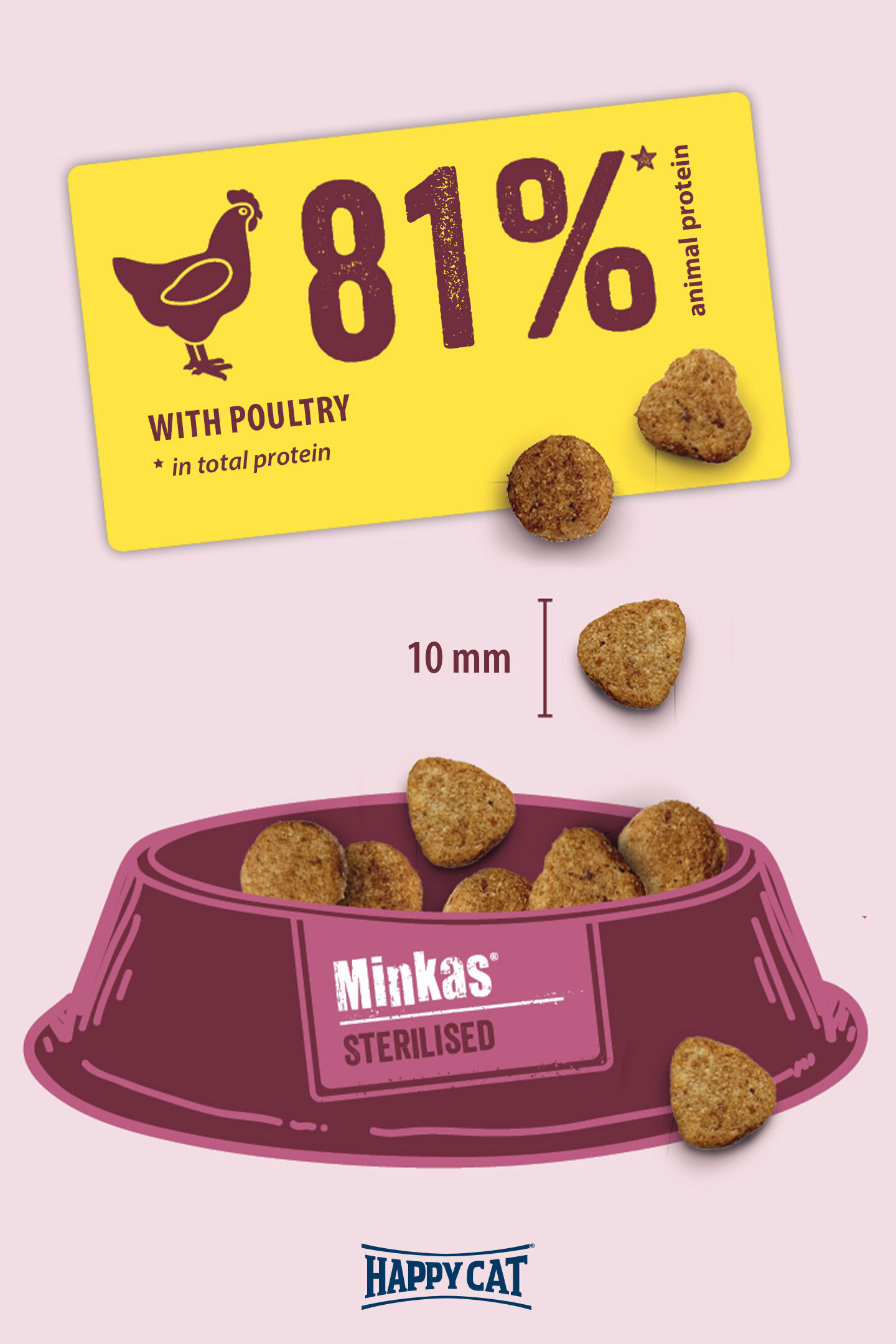 Our Happy Cat Minkas Sterilised Poultry is specially tailored to the needs of neutered cats. The balanced complete food, with its reduced fat content and the optimum amounts of satisfying fibre, helps your cat keep to their ideal weight. Our recipe, with its high proportion of valuable animal proteins, is 100% natural and balanced. This delicious dry food has many vitamins and minerals, and supports the immune system. Our recipes are naturally free from artificial flavourings and preservatives.